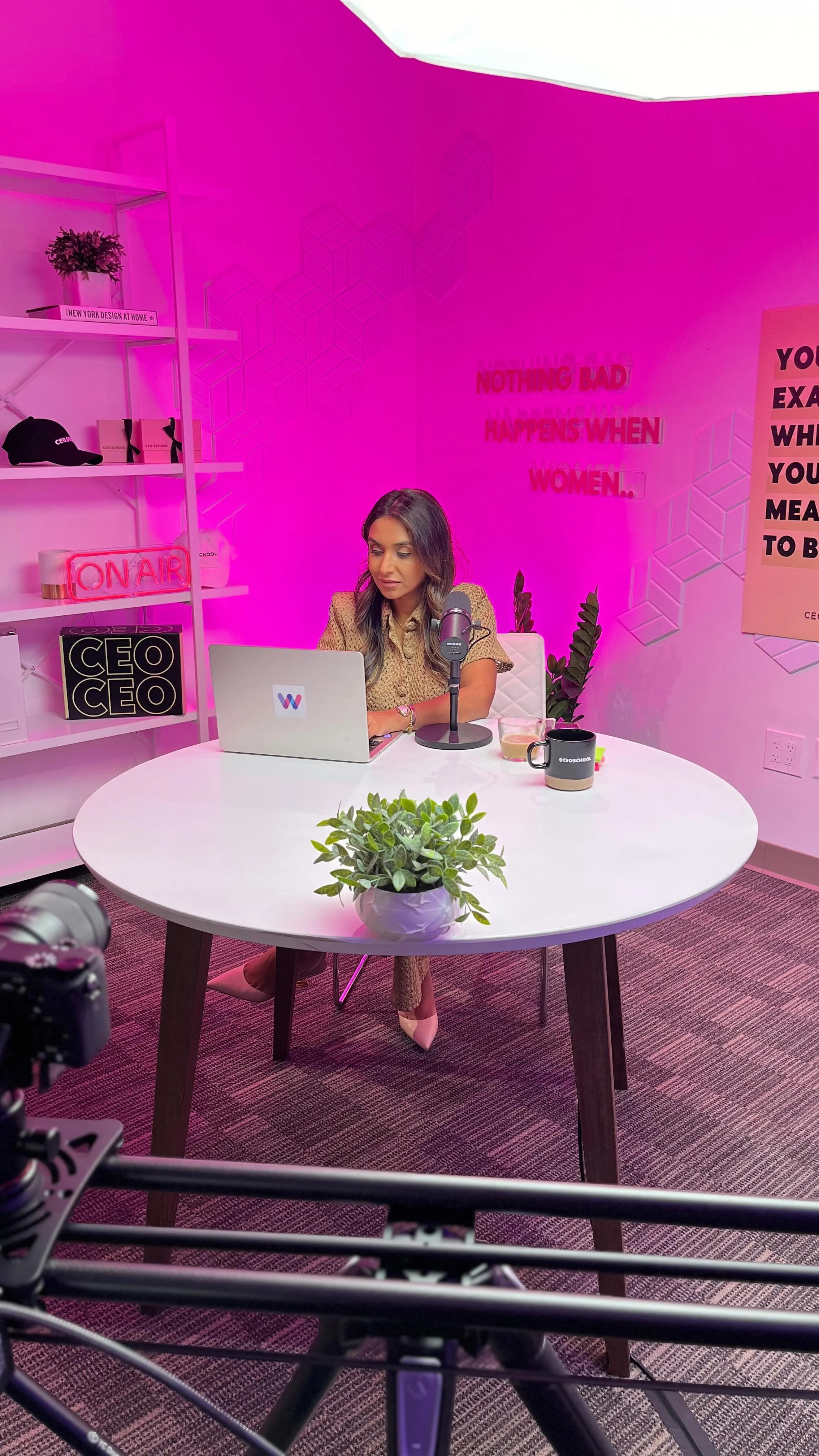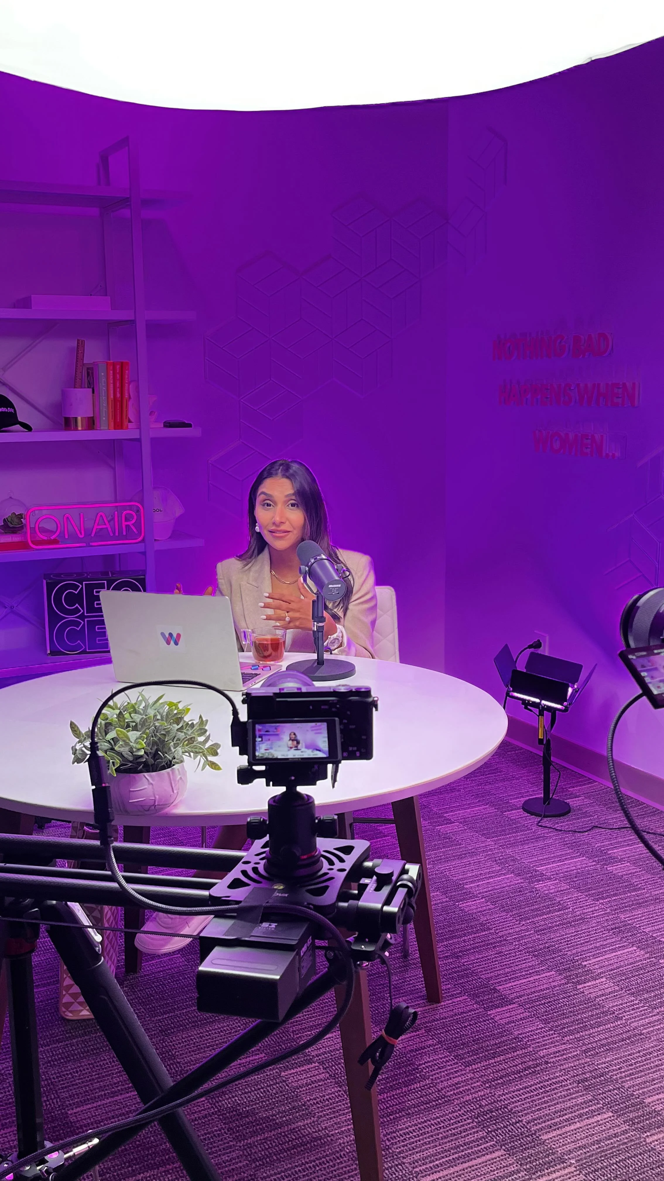 A modern podcast recording setup with two microphones on the table, a laptop, and a small wooden box. The room has pink and purple lighting, a white round table, and wooden chairs. In the background, a black metal shelving unit displays books, decorative objects, and a framed quote on the wall.