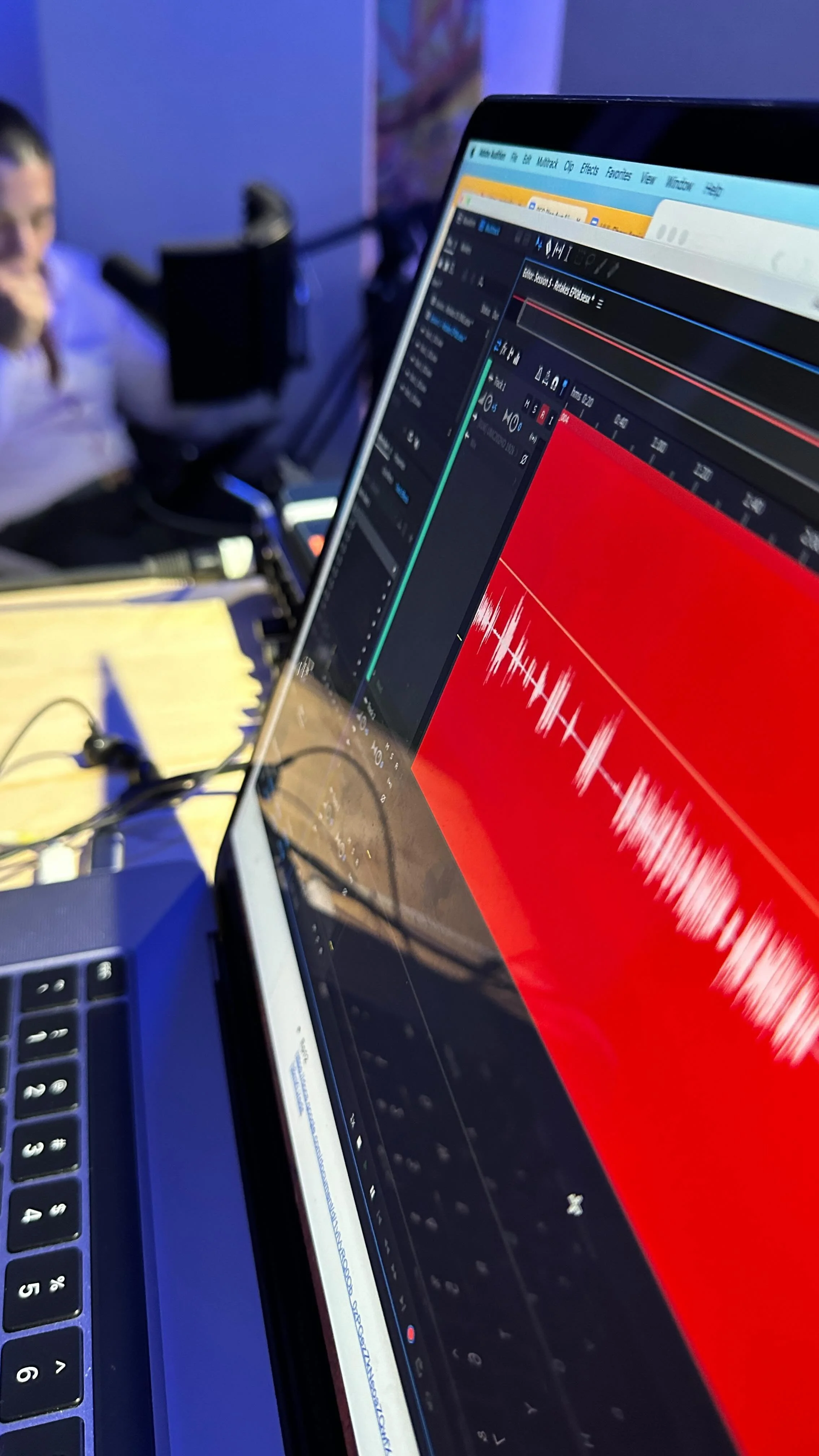 A microphone with a foam windscreen rests on a metallic surface, set against a background with blue and purple lighting.