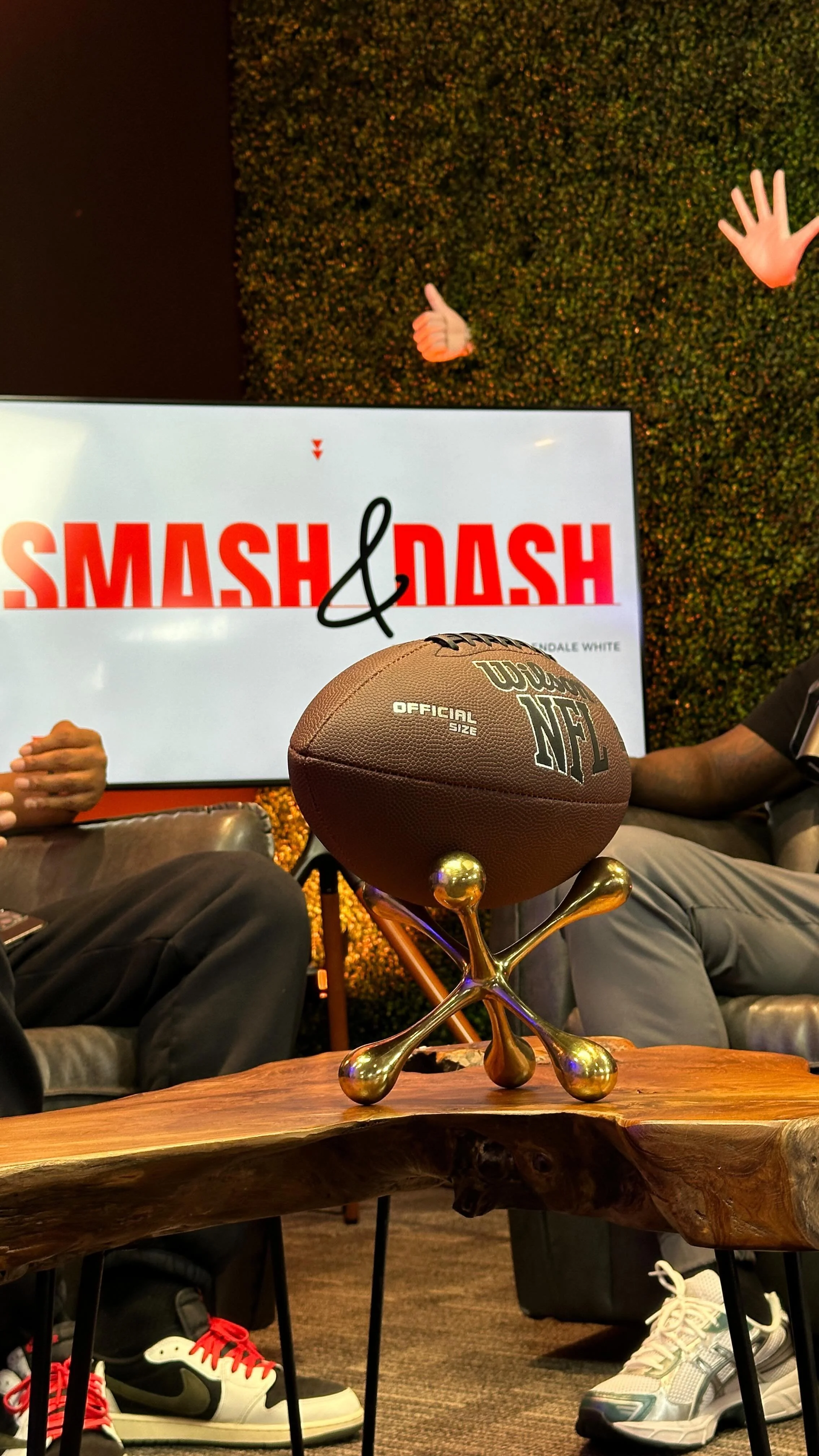 A cozy recording or interview setup with several chairs around a coffee table, microphones on stands, a plush navy-blue sofa with cushions, a side table with a potted plant, a dark green vertical garden wall with novelty hand and thumb sculptures, a wall art picture, and warm ambient lighting.